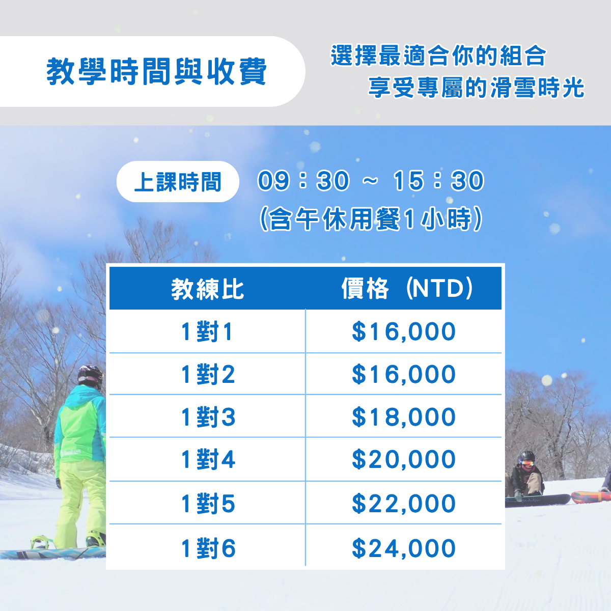 - 課程費用不包含滑雪器材裝備與纜車票,請於課程開始前自行完成租借與購票