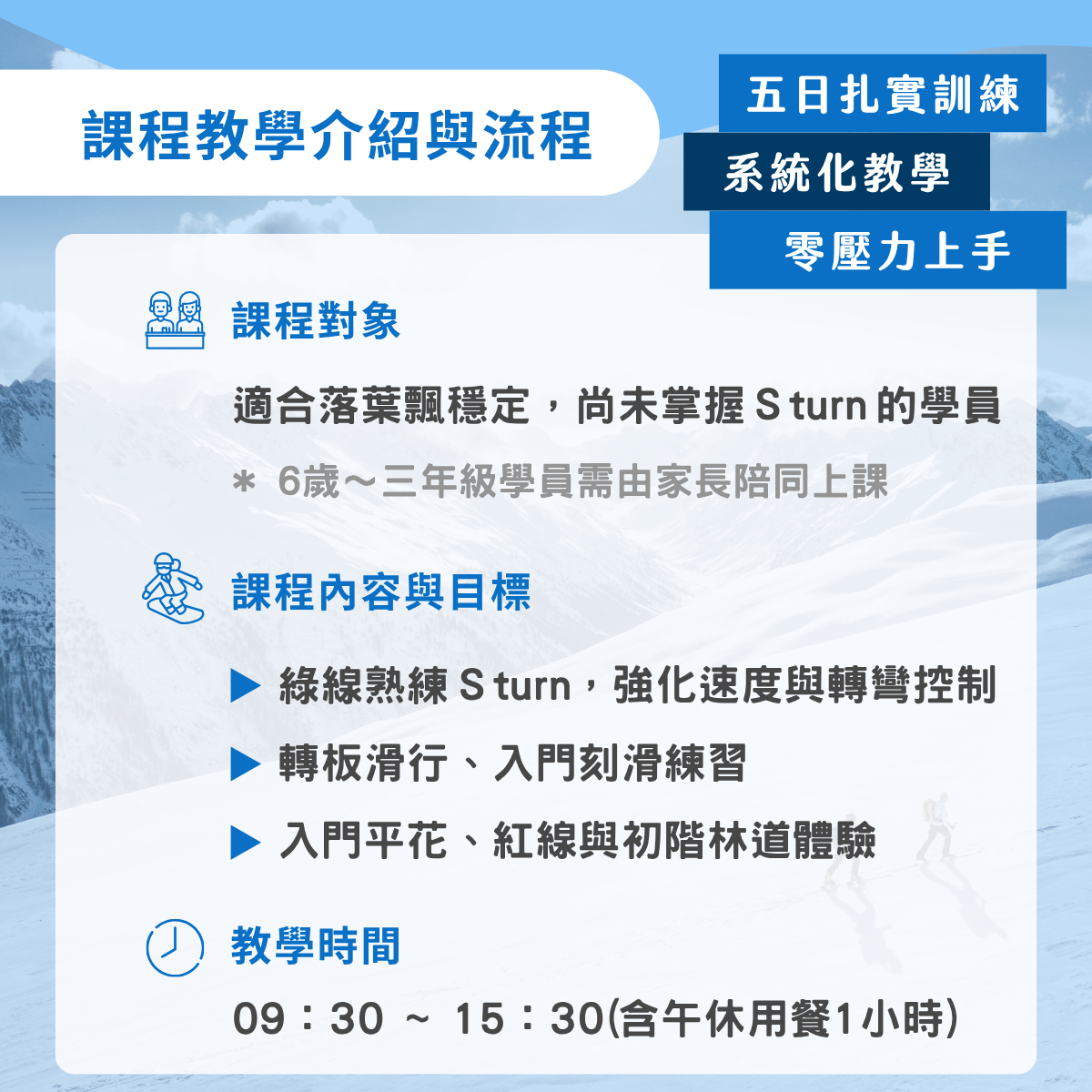 * 請於報名前審慎評估自身程度:由於此為中階課程,須具備相對應的滑雪程度,以確保上課期間能順利跟上教學進度;