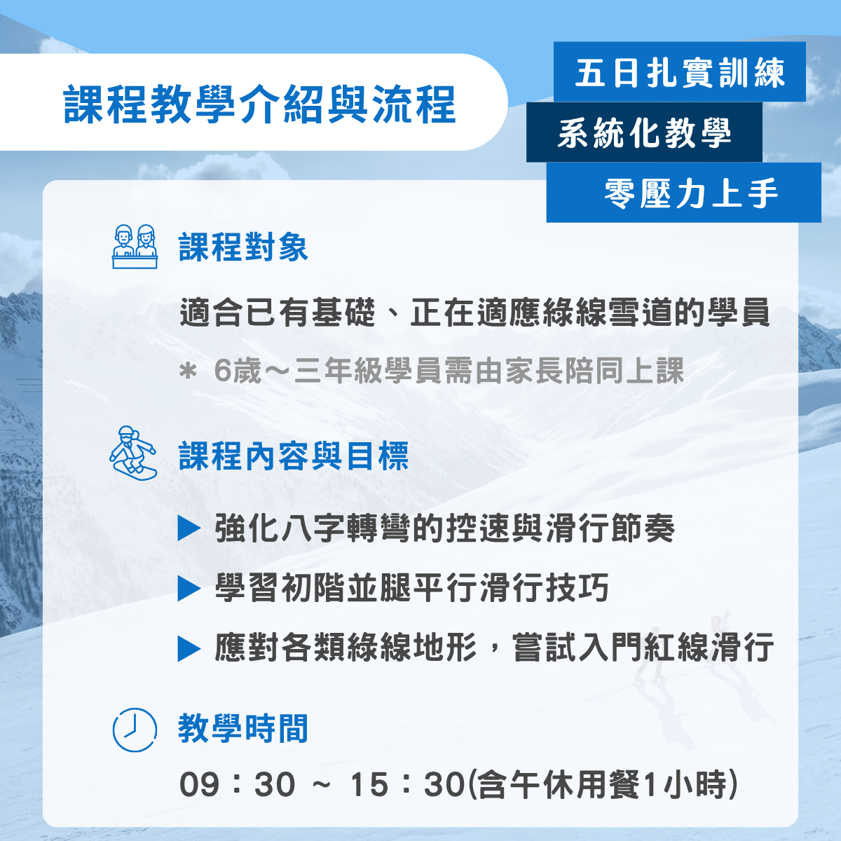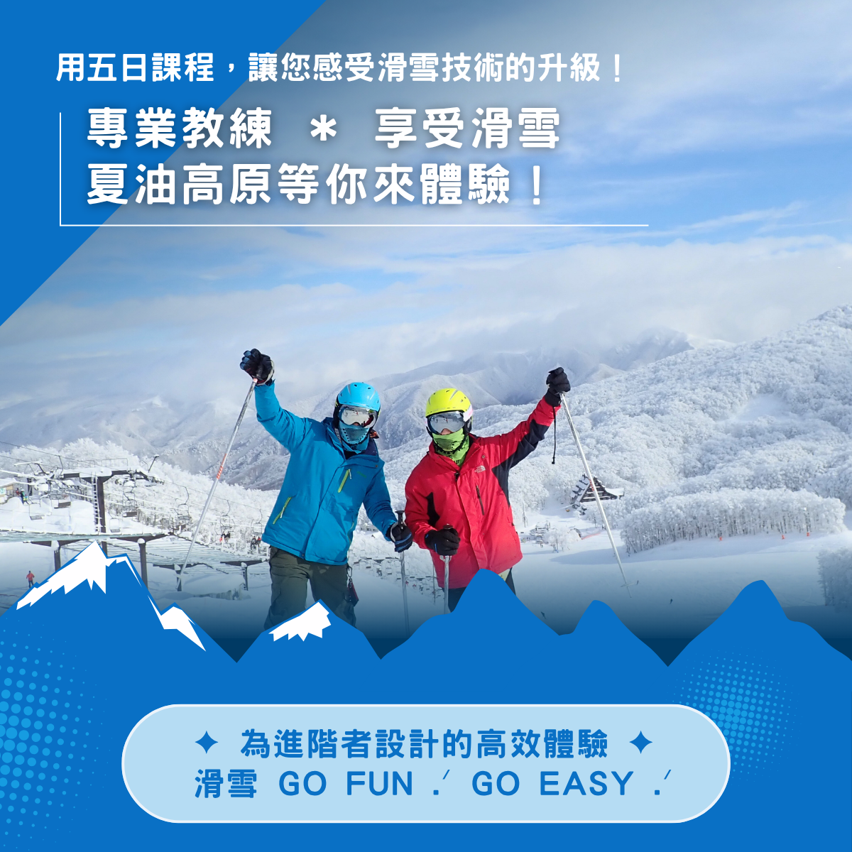 * 請於報名前審慎評估自身程度:由於此為中階課程,須具備相對應的滑雪程度,以確保上課期間能順利跟上教學進度;