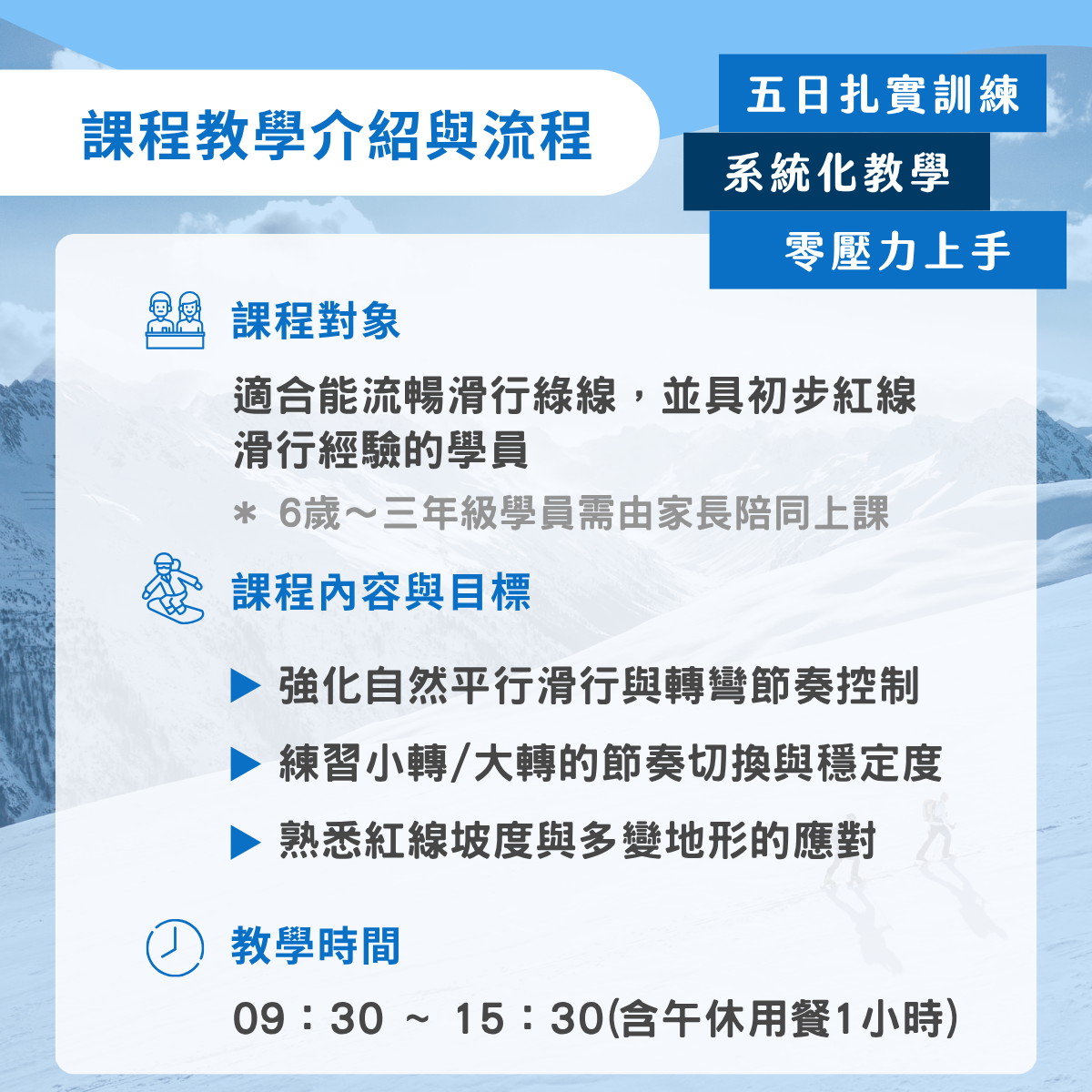 * 請於報名前審慎評估自身程度:由於此為中高階課程,須具備相對應的滑雪程度,以確保上課期間能順利跟上教學進度;