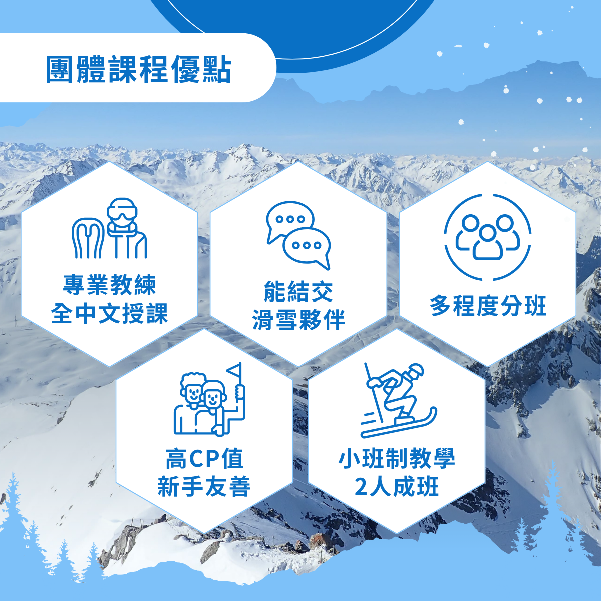- 建議滑雪服裝與配件:保暖服裝、滑雪服裝保暖帽、風鏡、手套、長筒保暖襪、安全帽 (Snowboard 課程必備)、護膝、護掌、護臀