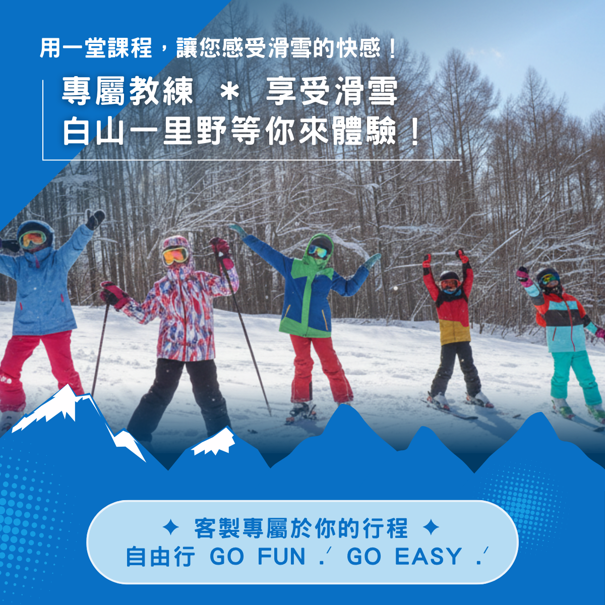 - 課程費用不包含滑雪器材裝備與纜車票,請於課程開始前自行完成租借與購票