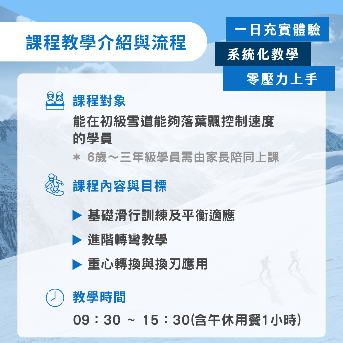 * 請於報名前審慎評估自身程度:由於此為進階課程,須具備相對應的滑雪程度,以確保上課期間能順利跟上教學進度;