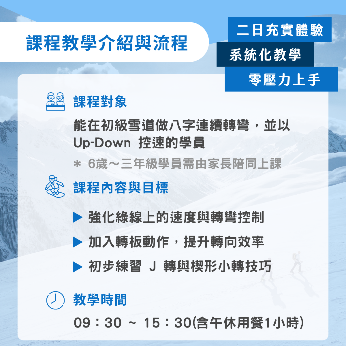 * 請於報名前審慎評估自身程度:由於此為進階課程,須具備相對應的滑雪程度,以確保上課期間能順利跟上教學進度;