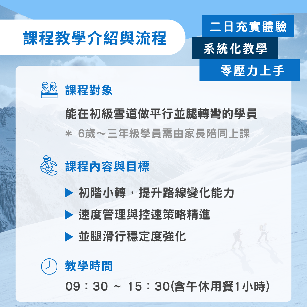 - 課程費用不包含滑雪器材裝備與纜車票,請於課程開始前自行完成租借與購票
